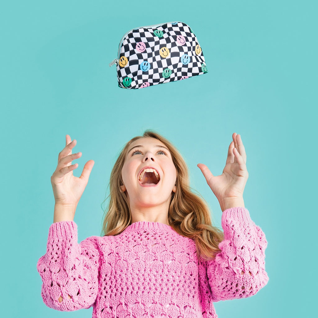 This fun pink happy faces print puffer bag is the perfect bag to hold your essentials.