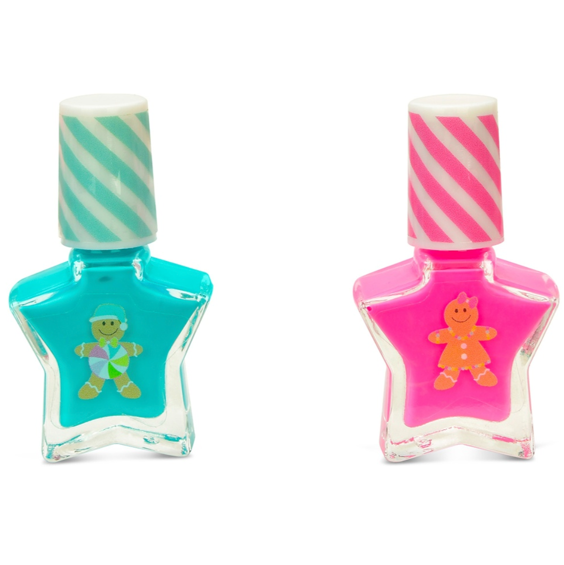 • 2 Star-Shaped Nail Polishes (0.12 oz / 3.5 mL each) – Bright teal & pink with gingerbread character accents.