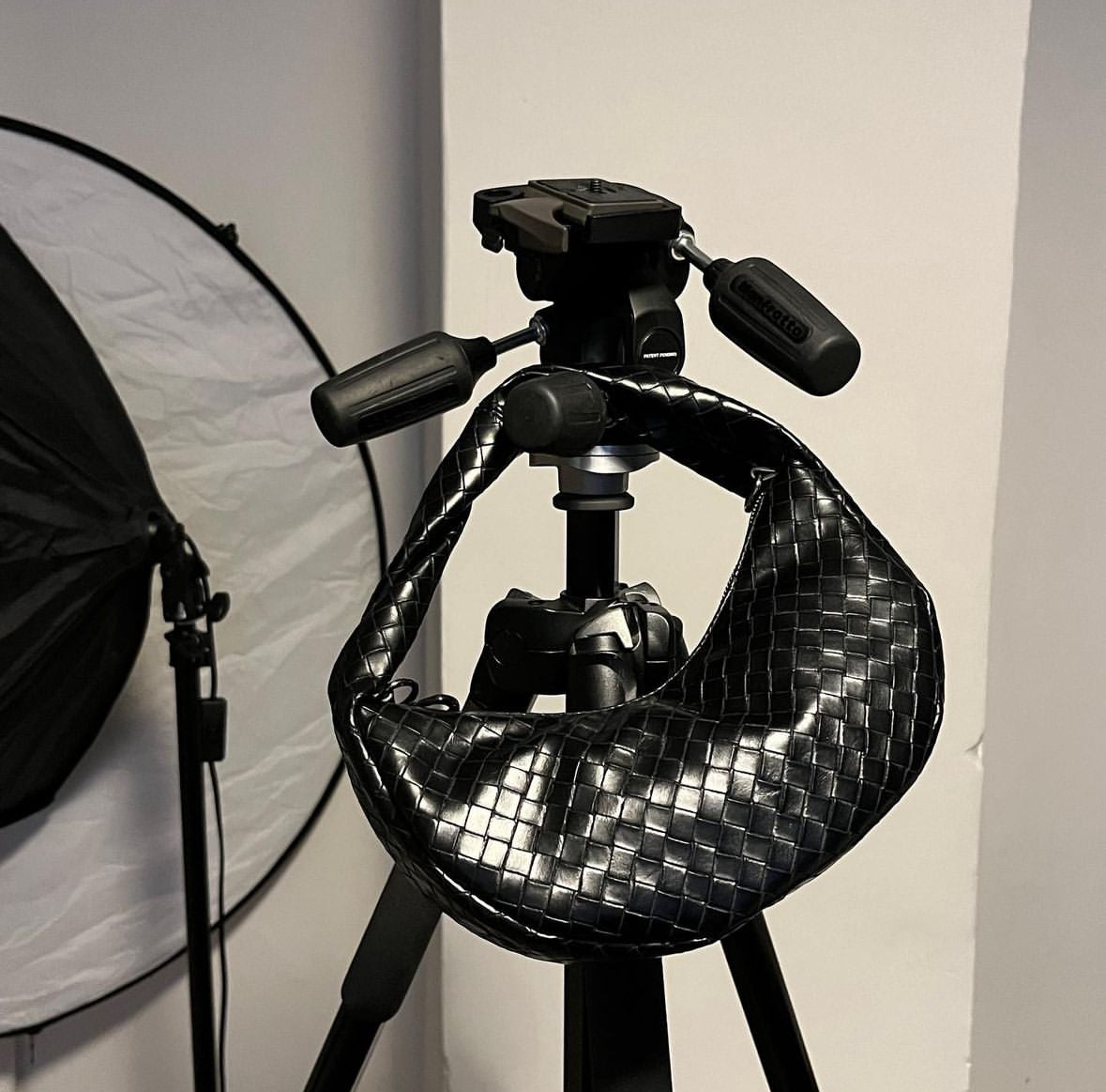 This moon bag features a large main compartment with a zip pocket inside. It has a twisted handle and can be worn as a shoulder bag.