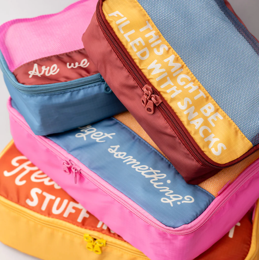 Colorful cubes that actually keep you sane in transit. This four-piece set sorts outfits, underwear, and “emergency snacks” into breathable mesh zip bags so you unpack a drawer in seconds and spot what you need at a glance. Each cube has double zipper pulls and playful prompts (“Are we there yet?”, “This might be filled with snacks,” “Really important stuff in here”) to make packing…fun.