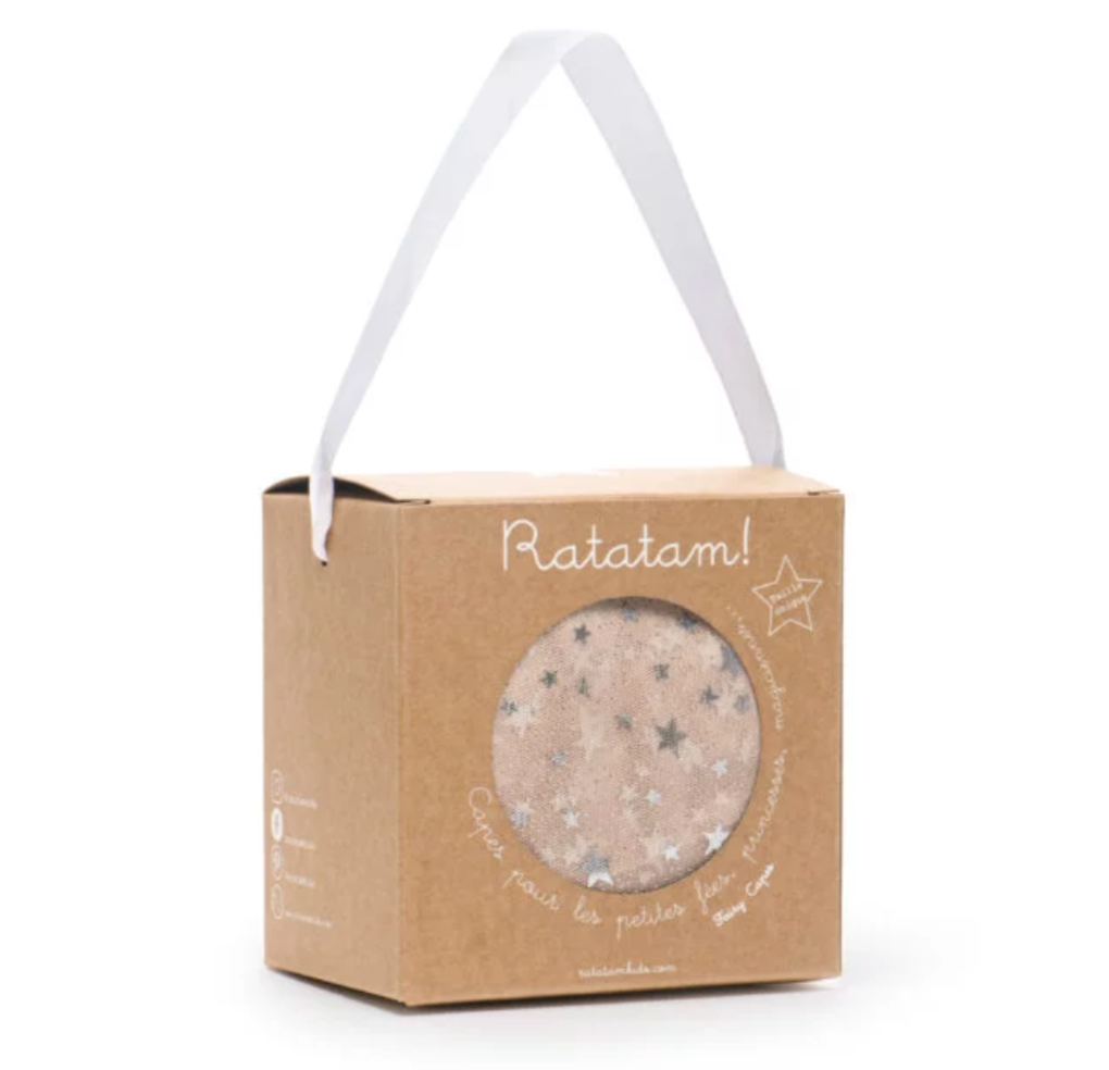 This hooded fairy cape is made of soft pink tulle adorned with silver star prints.
