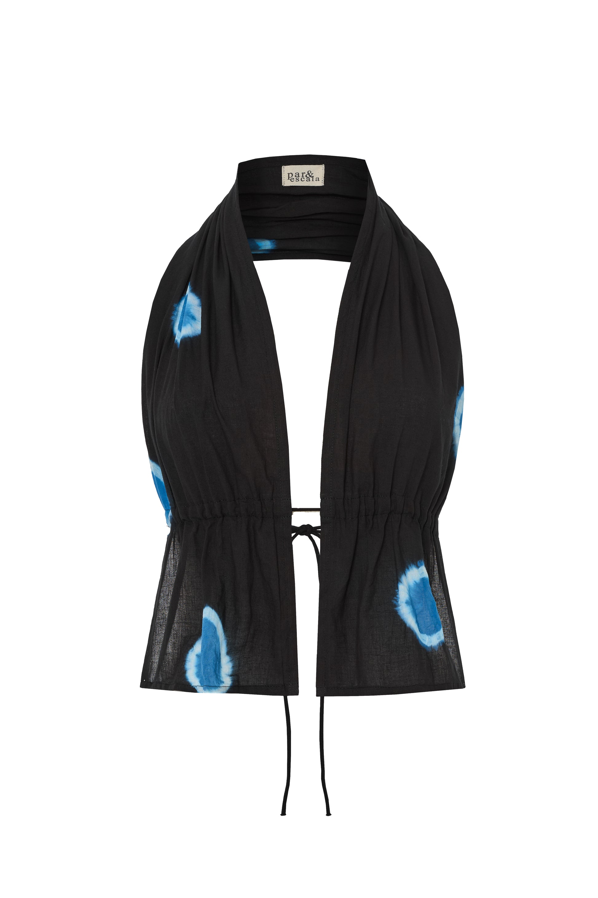 Hand-dyed with vibrant blue accents on a jet black base, each top carries its own unique pattern variation—no two are exactly alike. Light, breathable, and attention-grabbing, it's designed to take you from day to night, beach to bar.