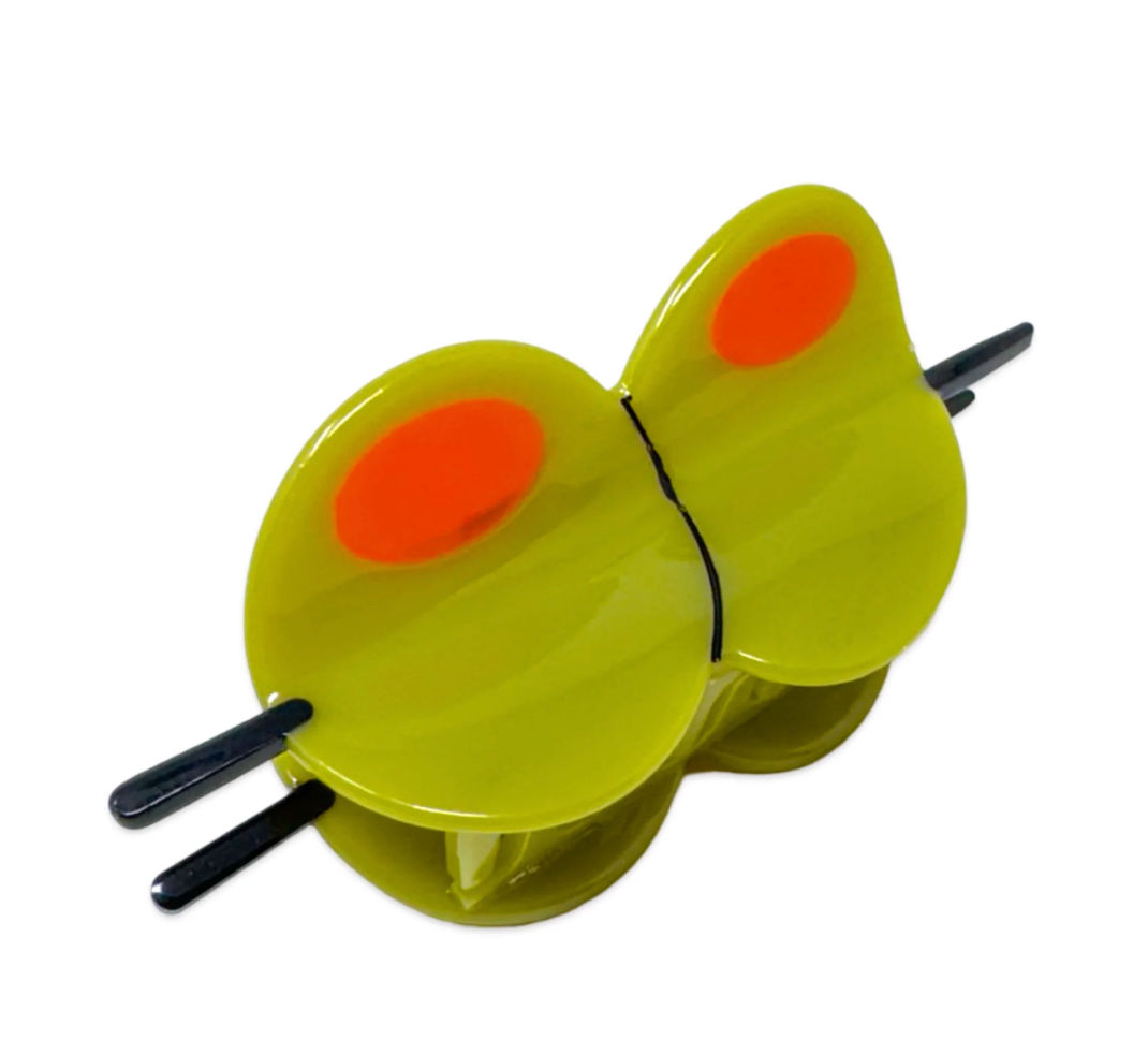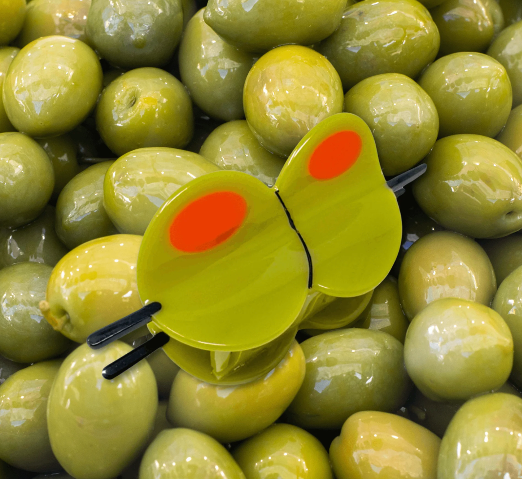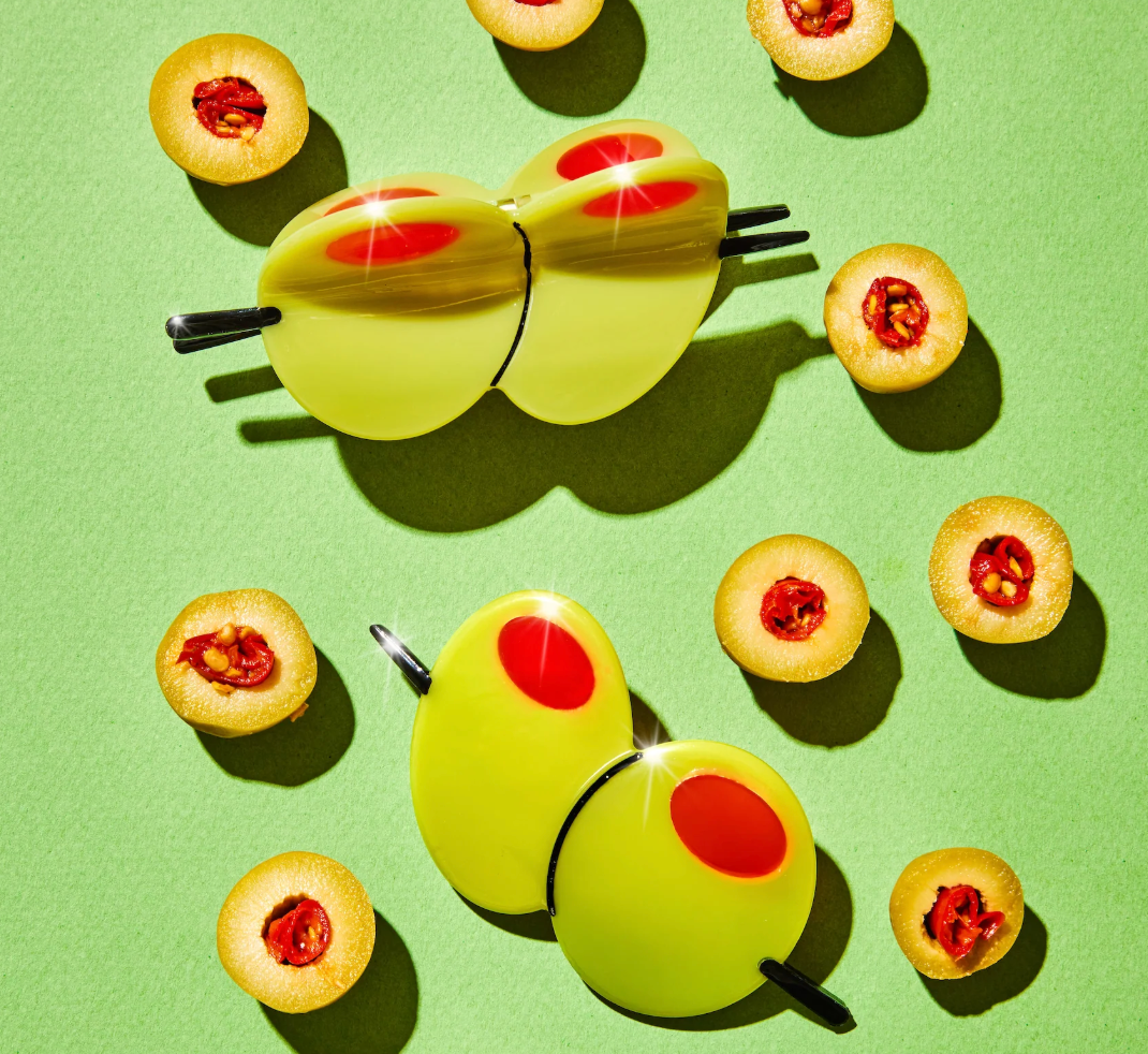 Featuring two martini olives on a toothpick with bright red pimento details, this playful hair claw is perfect for cocktail enthusiasts and olive lovers alike.